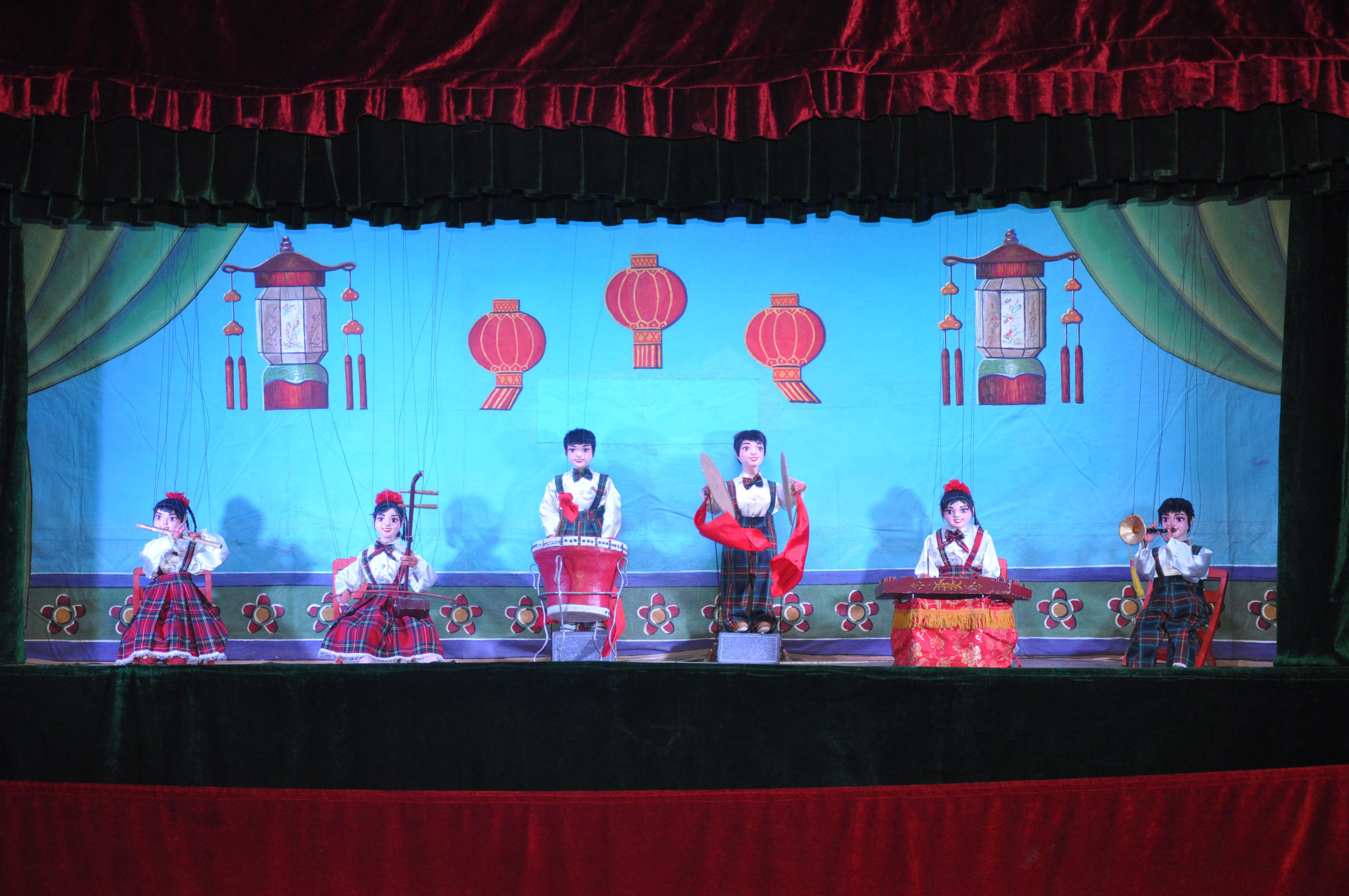 而后,木偶戏表演正式开始。第一场表演是鼓乐合奏,盛世欢歌。衣着青春靓丽服装的木偶用传统中国乐器唢呐、二胡、鼓等乐器演奏了欢快轻松的传统曲目“金蛇狂舞”。第二场表演为木偶戏保留曲目,取材于传统戏曲《白蛇传》的片段——水漫金山。帷幕缓缓拉开之后,木偶“青白二人”惟妙惟肖地缓缓登场,引来观众们阵阵喝彩。小小提线木偶逼真地刻画了人物形象,丰满地呈现了引人入胜的故事情节,并表演了众多高难度技艺如拔剑、射箭、翻筋斗等等。第三场表演为藏族舞蹈“在北京的金山上”。木偶衣着艳丽的藏族服装,在提线的控制下,形象地呈现了曼妙婀娜的舞姿。第四场表演为五华木偶剧团堪称梅州一绝的“木偶书法”,团长李新贤亲自出马,通过控制木偶身上的提线,用刚劲有力的笔触写出四个大字——“马到功成”,行云流水,笔锋凌厉,在场观众在惊叹其精湛绝伦的技艺之余,也报以热烈的掌声。最后的表演同样是五华木偶戏的保留曲目,取材于《水浒传》的喜剧表演——化子进城。小小提线木偶使出了舞狮、舞剑、喷火等精湛技艺,通过各种杂技表演展现故事情节,在场观众都看的非常入迷。