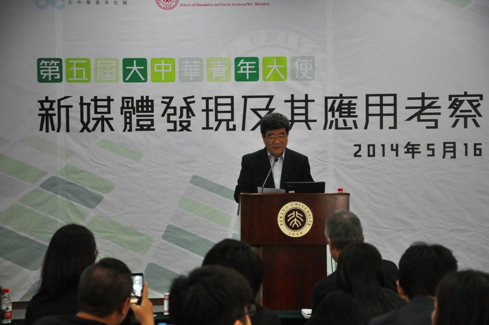 开幕式由叶韦明老师主持。叶老师首先详细介绍了本次活动开展的初衷和意义,又依次介绍了在场的嘉宾。在精彩的开场白之后,北京大学深圳研究生院人文社科学院院长海闻教授致开幕词。在讲话中,海闻教授首先对香港大中华青年在线考察团的到来表示欢迎,并着重强调了此次交流会的意义。随后,海闻教授指出,新媒体的发展一方面得益于国家经济发展水平、市民文化消费结构的提升,另一方面也得益于网络平台、社交媒体和移动终端等新技术的不断革新,也与香港的辐射带动作用息息相关。海闻教授围绕着“起飞”的经济学概念,对中国的经济发展进行了回顾和展望,同时建议香港大中华青年在线大使们可以从历史的角度出发了解中国。接着,海闻教授也介绍了深圳的腾飞历史,他把深圳比作当年的美国加州,指出了深圳发展的奇迹。与此同时,海闻教授提到了北京大学的历史使命和社会责任,并希望北大学生都需要以积极、开放的心态投入到学习中。最后,他也希望在座的各位能在相互交流中有所发现,有所收获,并祝愿本次交流活动圆满举办。海闻教授充满历史和国际视野的讲话深深感染了全场,现场气氛轻松、活跃。