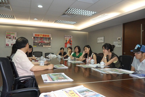 同学们还参观了编辑室,实地体会了解到了记者编辑的工作环境。随后,副主编兼社长办公室主任王伟和老师同学们进行了座谈。他回答了同学们提出的大公报办报理念是否与时俱进、如何面对新媒体对传统媒体的冲击、如何应对免费报纸的冲击等问题。最后,王伟副主编强调了新闻工作的重要性。他说,新闻工作是很有意义的,每天都能经历不同的人和事情,对社会也能产生重大的影响,并鼓励同学们能够在以后为新闻事业多做贡献。