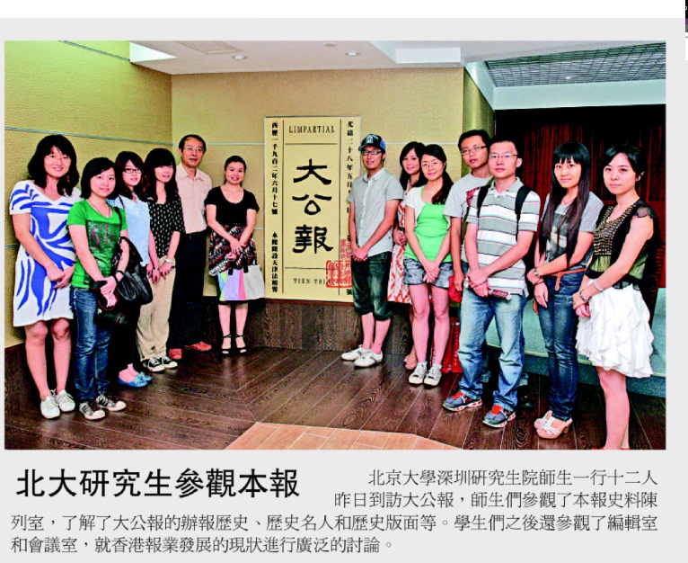 之后,艾彦老师发言说,此次访港,对于各位研究生同学来说是一次生动的新闻史寻根之旅,她代表10传播学班对大公报的热情接待表示感谢,并希望与大公报有更多的合作与交流机会。会后,大公报领导与我院老师相互交换了礼物。21日的《大公报》对师生到访做了报道。