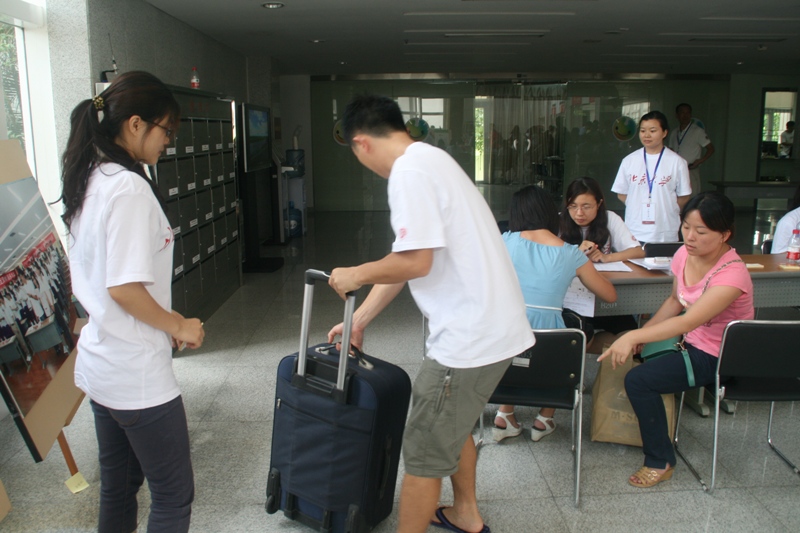 整个迎新报到的流程分为:持入学通知书报到,交身份证复印件,签到、核对信息,领取迎新活动文件夹,前往3号台办理缴费等其他手续,最后是宿舍区入住手续。在报到处的志愿者们细心地为新同学们办理着各项手续,耐心、热情地解答着同学们提出的问题,并按学号将提前准备好的资料夹发给他们,里面有详细的入学安排、指导手册,这些资料可以让新生尽快地熟悉深研院的环境,以帮助他们很快适应新的研究生生活。整个过程显得有条不紊、秩序井然。负责送新生入住的同学不怕苦、不怕累顶着烈日、拖着行李不停地往返于宿舍楼与H栋之间。