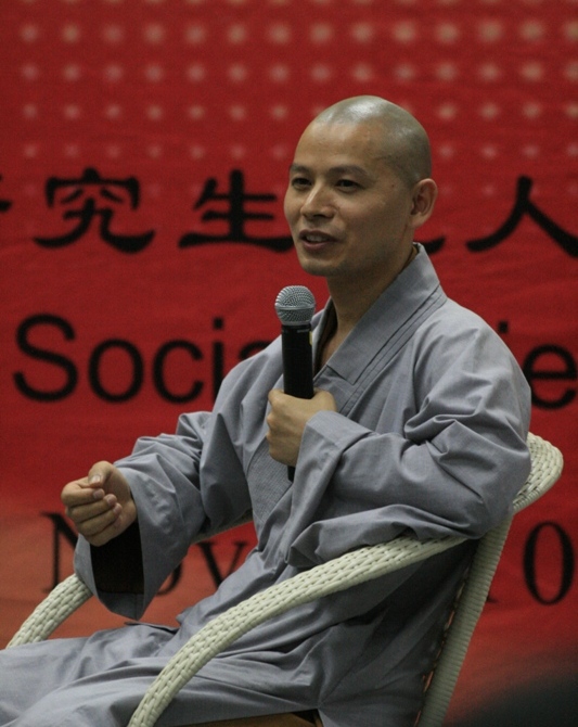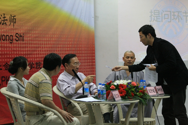 其间,社会学系副教授李康老师也加入到激烈的人生对话中来。他提出,当今社会,人的基本权利被剥夺,被放弃,自尊尚难维持,如何在日常生活中坚守一种忍让和放弃的品格?张医生答到,我们要用发展的眼光去看待这个社会,用“不抛弃,不放弃”的姿态,心存希望,去善待这个社会,坚持自我,同时也理解别人。中勇法师则从另一个角度说明了现代物质社会自我道德取向的意义。