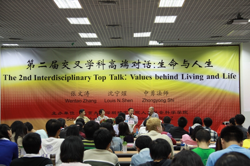 11月23日晚,以“生命与人生”为主题的第二届交叉学科高端对话在B栋模拟法庭隆重开展。北大深圳医院运动医学与康复科主任张文涛医生,深港产学研基地高级顾问、理事会副秘书长沈宁燿教授,弘法寺堂主兼衣钵、深圳市佛教协会第二届常务理事中勇法师分别作为医学界、科学界和佛学界的代表,与大学城学子共同叩问生命,对话人生。人文社会科学学院副院长于长江及部分老师也出席了本次论坛。