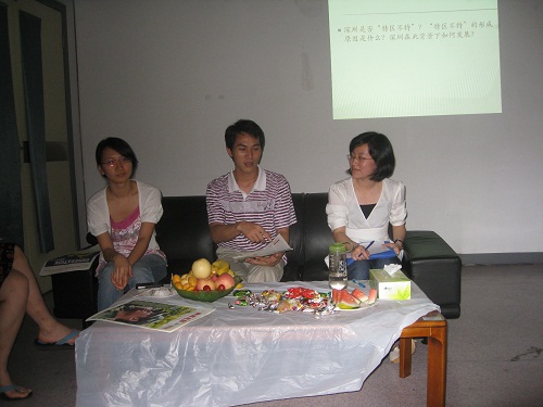 接着,师生们就深圳是否面临“特区不特”的尴尬、深圳何以成为民企生长的土壤、深圳的“山寨文化”等问题进行了热烈的探讨。有同学认为,深圳的城市规划不够科学,深圳成了“山寨”的代名词。人文学院于长江副院长对同学们的讨论进行点评,于老师认为,深圳的城市规划开启全国新一轮城市化之先,内地没有可供借鉴的先例,一些道路、建筑规划不够科学有其历史原因。于老师还饶有兴致地从音韵学的视角,分析“山寨”即来源于“深圳”的粤语发音。因此“山寨文化”可能即指“深圳文化”。