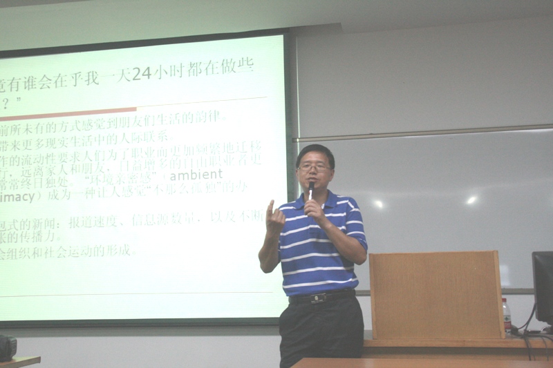 那么,微博的始祖是谁?Twitter为何诞生?中国为什么会兴起微博热潮?中国的微博现状如何?作为国内最早研究互联网的学者之一,胡老师深入浅出地为大家讲解twitter诞生的背景,结合生动有趣的例子逐步分析中国的微博引进之路,对比twitter与国内微博的异同和现在的微博大战,博得到场师生阵阵掌声。