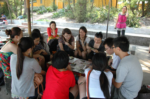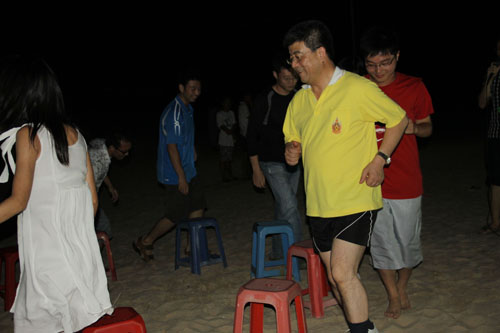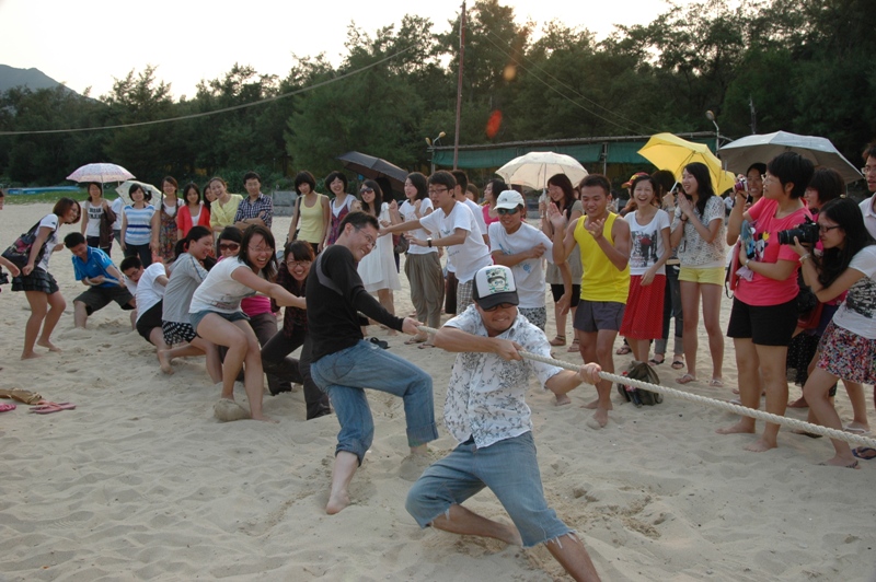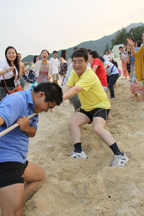 正当游戏、拍照、运动进行地如火如荼之际,又一项精彩好戏上演了。傍晚五点,在09社会、09心理、10传播、10社会、10心理五支队伍之间进行的拔河淘汰赛热辣开赛,各队由五名男生、五名女生构成,个个卯足了劲,实力不容小觑,由班级成员组成的啦啦队也不甘示弱,呐喊声、助威声伴着海浪咆哮而来。经过一轮轮艰难而激烈的角逐,最终,09社会和10社会两支队伍脱颖而出,握手言和。其间,海闻院长在传播学系同学的盛情邀请下,加盟“男少女多”的10传播队伍,虽然最终全队不敌10社会,但集体努力、共同进退的乐趣无不令同学们感怀。