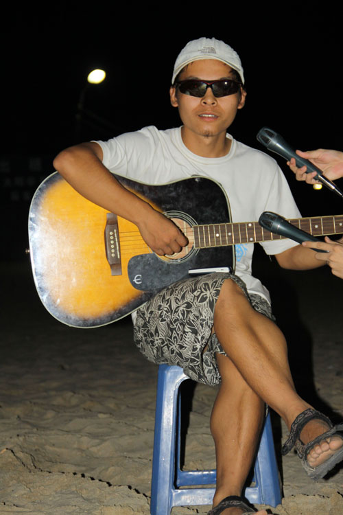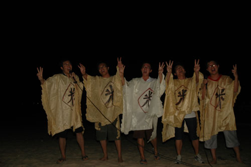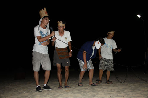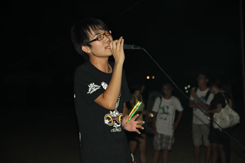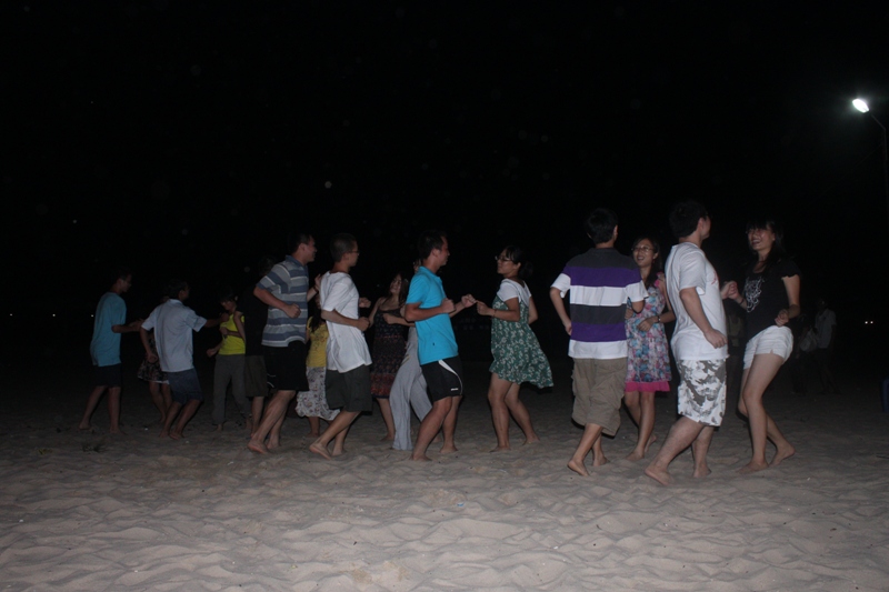 酒足饭饱,月已当空。海滩上,早已架起音响,在传播学女生们的青春舞曲之后,联欢晚会开始了。晚会期间,全院师生大展才艺:雅俗共赏的歌曲串烧“换大米进行曲”令在场观众笑声不断;恶搞话剧“大话西游”更是搏得满堂彩,演员们惟妙惟肖的表演,夸张搞笑的肢体动作,进一步将晚会气氛调动起来;由10级社会学的全体同学们表演的“桃花朵朵开”,将男女速配过程展示得淋漓尽致;相声节目幽默诙谐,二位男生尽展“说学斗唱”之才;“水果蹲”游戏活泼俏皮,惩罚环节刺激又过瘾;民族歌曲“火把节的火把”、流行歌曲大连唱等歌唱类节目可谓赏心悦目,台上台下瞬间变为一片歌唱的海洋。