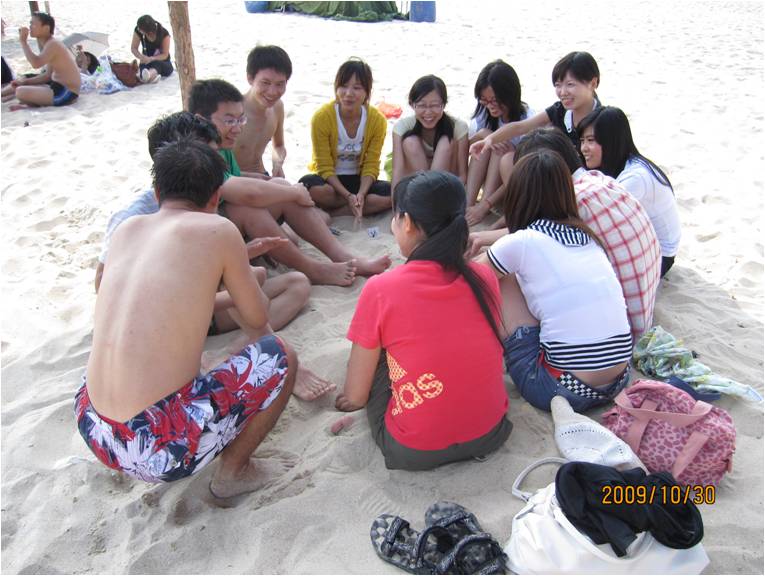 2009年10月30日,阳光明媚、风淡云轻,在班委的组织下,09社会学班级全体同学前往美丽的西冲海边开展了为期一天的素质拓展活动。碧波浩淼的大海、丰富多彩的拓展游戏、乐趣无穷的自助烧烤Party,让同学们在游戏中展现了智慧和幽默,在Party中感受了友谊和欢乐,展示了09社会学的磅礴朝气!