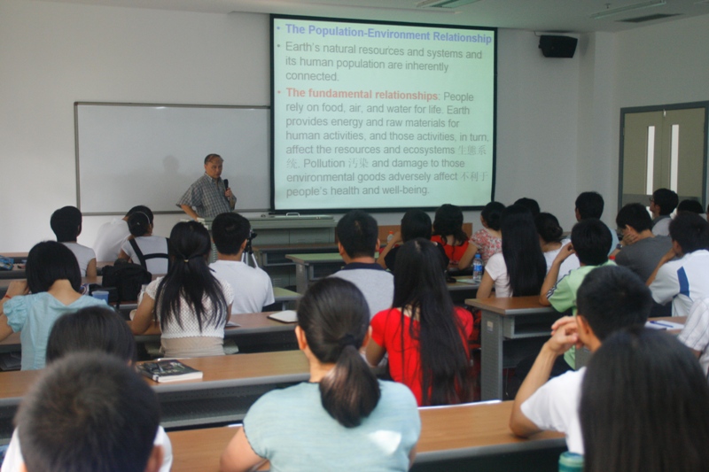 李老师首先对涂教授进行了简单的介绍,他笑称涂老师经历十分丰富——出生在大陆,成长在台湾,家在美国,工作在香港——因此同学们可以在各方面展开提问,涂教授十分乐意解答。涂教授对李老师的介绍表示了感谢,然后对本次讲座的题目进行了解释:力图说明目前中国的环境是怎么回事。他从人口与环境的关系这个方面展开了讲演,细述了人口的变化对环境造成的直接影响与间接影响,指出了在目前的环境状况坚持可持续发展的重要性。关于目前科学界中对环境问题持不同态度的“乐观学派”与“悲观学派”,涂教授也展开了阐述与对比。接着他对中国环境问题的持续恶化进行了批评,认为中国只专注于经济的增长而忽略环境的保护,不仅对本国造成了危害,也对全球环境造成了危害。他详细地剖析了目前各方面的环境问题,如水源危机、气候变化、空气污染、森林退化、土地沙漠化等等,认为正是对短期经济效益的片面追求导致了这些问题的恶化。涂教授表明目前中国在环境保护上其实存在着若干优势,如强大的公共财政与经济支持,全球在气候变暖问题上的关注等等。他以20世纪70年代的日本为例,指出只有真正改变发展战略,促进技术革新,提高资源利用效率,鼓励人民与政府的积极互动,中国乃至全球的环境才能真正得到良性的改变。