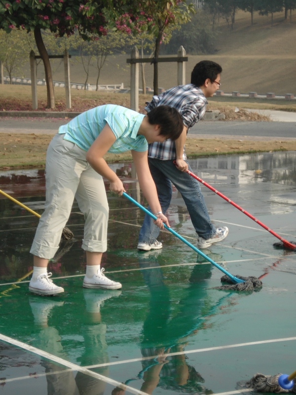 同学们从后勤处借来了拖把、扫把等工具,从保洁人员那里拉来了长长的水管。劳动工具虽然不多,但每个同学都能积极的帮忙。没工具的先行把场上飘落的树叶等垃圾捡走,“扫把军”过滤了一遍排球场后再也看不出原来的灰土覆盖。不料,水笼头却出了一点故障,迟迟不见有水冒出。看到周围草坪上的喷洒装备暂不能用,06心理学的同学首先从M栋引来了水源,开始了清洗,07传播学的同学则与管理员商量后从消防栓处引水。同学们个个劲头十足,只在一小时之内就清洁完毕。