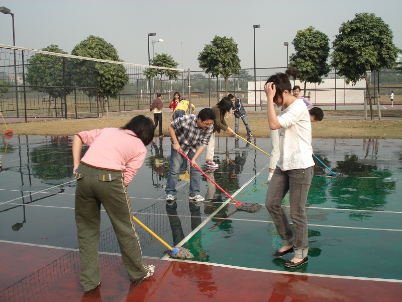 下午,排球场果然是一番热火朝天的景象,然而却不是想象中的排球赛,每个人正奋力地清洗着排球场的地板。原来这是一场人文学院组织的劳动,为近期紧张的排球赛营造一个更干净的比赛环境。