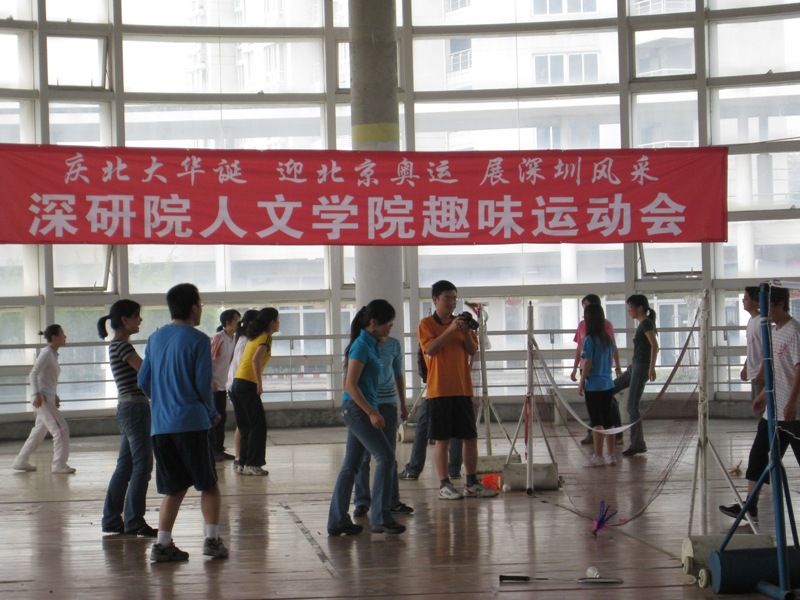 在北京大学110周年华诞之际,为了在校园内营造强身健体的良好氛围,彰显北大学子积极向上的精神风貌,人文学院于4月26日、27日在羽毛球馆举办了一场集趣味性与竞技性于一体的运动会,向北大110周年华诞献礼。学院06级、07级学生积极踊跃地参加了运动会。