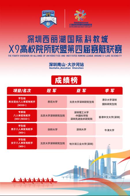 劈波斩浪,智竞未来。经过激烈的比拼,剑桥大学、深圳大学、牛津大学分别夺得学生组男子八人单桨有舵手的冠、亚、季军,北京大学深圳研究生院、哈尔滨工业大学(深圳)分别夺得学生组女子八人单桨有舵手的冠亚军,悉尼大学、北京大学深圳研究生院、清华大学深圳国际研究生院分别夺得学生组男女混合八人单桨有舵手的冠亚季军,北京大学深圳研究生院、深理工—先进院联队、香港中文大学(深圳)分别夺得专家组八人单桨有舵手的冠亚季军。