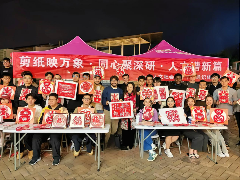 为创新教学方法,课程采用“讲授+阅读+讨论+报告+实践”的多元教学模式,鼓励学生主动参与,并结合自身文化背景进行跨国比较。课程还特别设置了实践环节,本学期的最后一堂收官课程以“剪纸映万象·同心聚深研·人文谱新篇”为主题,在深研院镜湖畔举办了剪纸体验开放式课程,吸引了约40位来自世界各地的留学生积极参与。在这堂精彩纷呈的中国文化课上,大家共同领略了剪纸艺术的独特魅力,感受了中华文化的深厚底蕴。